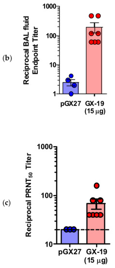 pGX27-SΔTM, named GX-19, was therefore selected as the vaccine candidate to advance to immunogenicity and efficacy studies. The immunization with GX-19 elicited significant serum IgG responses against the S protein in a dose-dependent manner (Figure 2a). GX-19 vaccination elicited an S-specific IgG response in the bronchoalveolar lavage (BAL) fluid (Figure 2b). Live virus neutralizing titers were also evaluated in BALB/C mice following the same GX-19 immunization regimen. Consistent with the S binding antibody response, neutralizing activity was elicited by GX-19 (Figure 2c).