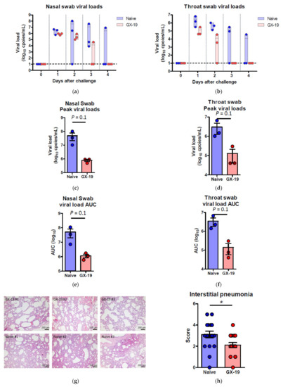 Protective efficacy of GX-19 against SARS-CoV-2 challenge. Non-vaccinated (n = 3, blue) and GX-19-vaccinated macaques (n = 3, red) were challenged by intratracheal, oral, conjunctival, intranasal, and intravenous administration of 2.7 × 107 TCID50 SARS-CoV-2. Viral load was assessed in nasal swab (a) and throat swab (b) at multiple time points following challenge. Summary of peak viral loads and viral load area under the curve (AUC) in nasal swab (c,e) and throat swab (d,f) following challenge. Dashed line indicates the assay limit of detection. Histopathological changes in the lungs of SARS-CoV-2-challenged macaques (g). Interstitial pneumonia score by microscopic evaluation (n = 6 lung lobes of each animal per group) (h). The lung tissue sections were stained with hematoxylin and eosin (H&E). Data of (a–f) are represented as individual values. Data of (h) is represented as 6 lung lobes of each animal per group. p-Values determined by the Mann–Whitney test; p-values are shown * p < 0.05 as determined by the Mann–Whitney test.
