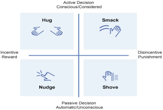 - Oliver, A. Nudges, shoves and budges: Behavioural economic policy frameworks. Int. J. Health Plan. Manag. 2017, 33, 272–275. [Google Scholar] [CrossRef] [PubMed]