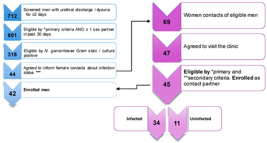 In the period from December 2017 to November 2019, 601 men with symptoms of gonorrhea visited the NCSTD clinic, where they were confirmed to be infected by N. gonorrhoeae. Over 50% of these men were eligible to participate in the study but only a minority of subjects agreed to inform their female partners about the gonorrhea diagnosis, thus reducing the pool of potentially eligible women. Among the women who indeed contacted the NCSTD clinic, only 68% visited the clinic. Ultimately, 42 men and 45 women were enrolled (3 men enrolled 2 female partners each) (Figure 1).