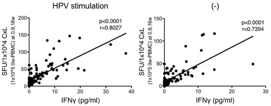 In our previous clinical trial, we collected CxLs from patients with CIN and measured the number of IFNγ-producing cells using the ELISPOT assay to investigate the E7-specific Th1-type immune response in local cervical lesions [15]. GLBL101c exerts pharmacological effects through mucosal immunity, and therefore we considered that this evaluation system of mucosal immune responses (IFNγ-ELISPOT assay using CxLs) is the direct method. However, CxLs have a disadvantage in that the number of lymphocytes that can be collected varies due to individual differences in cervical mucus secretion and changes in the composition of immune cells depending on the time of collection (i.e., the time of the menstrual cycle) [12]. Therefore, an evaluation system using PBMCs, in which the number of lymphocytes does not vary individually, was implemented in this clinical trial. In addition to the number of IFNγ-producing cells in CxLs, we examined the amount of IFNγ secreted from CxL by E7-peptide stimulation. CxLs were collected from patients at week 9 or 16 regardless of whether in the GLBL101c or placebo group. Figure 1 demonstrates the correlation between the numbers of IFNγ-producing cells determined by the ELISPOT assay and the amount of IFNγ (protein) secreted from CxLs. This confirmed that the ELISPOT assay used in this trial reflected IFNγ production (Th1 immune response) and that IFNγ production was not detected only in PBMCs, although PBMCs were used as antigen-presenting cells in the ELISPOT assay.