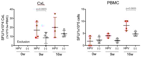 Time-dependent increases in the number of IFNγ-producing cells in the GLBL101c group. The number of IFNγ-producing cells at pre-immune (0 week), 9 week, and 16 week was compared for CxL and PBMC with (red dot) and without (circle dot) E7 stimulation. The number of spots with E7 stimulation (HPV+) tended to increase in a time-dependent manner, with three samples showing a similar increase.
