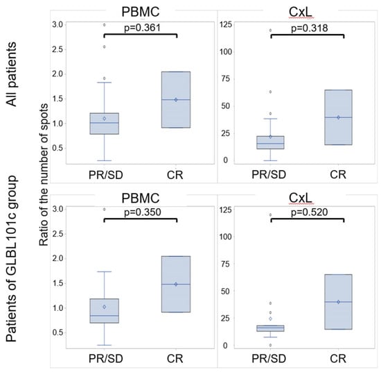 Ratio of the increase in the number of spots with to without E7 stimulation, comparing CR and PR/SD cases. The ratios for all patients (upper panels) or patients of GLBL101c group (lower panels) were plotted for PBMC (left panels) or CxL (right panels). Plot means each case. Box and bars mean 25–75% of all ratios and median and 1-SD, respectively. E7-specific Th1 immune response tended to be higher in CR patients in both PBMC and CxL when compared with PR/SD patients.