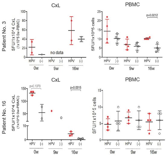 Increase in the number of IFNγ-producing cells in the patients with CR. The number of spots of CxL and PBMC at pre-immune (0week), 9 week, and 16 week was shown for patients 3 and 16 of CR cases that regressed to normal within only 4 months. In both cases, at week 16, E7 stimulation (HPV+; red dot) was significantly elevated compared to no E7 stimulation although the number of spots without stimulation (black dot) varied from specimen to specimen.