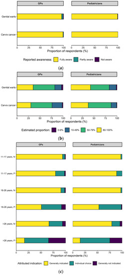 (a) The reported awareness of association of human papillomavirus (HPV) infection with cervix cancer and genital warts. (b) For the same diseases, the estimated fraction of cases preventable by the currently available nine-valent HPV vaccine. (c) The indication attributed to HPV vaccination for different population groups. Abbreviations: general practitioners (GPs); negative history of sexual intercourse (N); positive history of sexual intercourse (P).