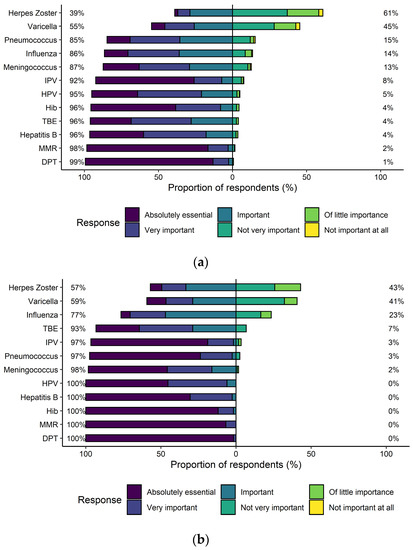 The relevance attributed to recommendations of the Swiss vaccination schedule [10] with the responses stratified into general practitioners (a) and pediatricians (b). Abbreviations: diphtheria, pertussis, tetanus (DPT); Haemophilus influenzae type b (Hib); human papillomavirus (HPV); inactivated polio vaccine (IPV); measles, mumps, rubella (MMR); tick-borne encephalitis (TBE).
