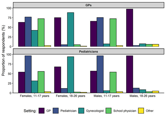 Figure 3 shows the healthcare settings deemed to pose the greatest opportunity to reach different age and gender groups (females and males aged 11–17 years and 18–26 years) for HPV vaccines. Overall, the GP was chosen most frequently for males aged 18–26 years (97.1% of respondents), while being chosen less often (73.0% of respondents) than the gynecologist (90.0% of respondents) for females aged 18–26 years. For both females and males aged 11–17 years, the pediatrician was indicated most frequently (82.3% and 81.4% of respondents, respectively), followed by the school physician (67.8% and 67.3% of respondents, respectively).