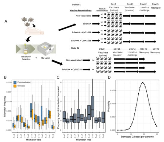 Production of SolaVAX vaccine and sequence-based detection of RNA damage in photoinactivated virus preparations. (A) SARS-CoV-2 virus (isolate USA-WA1/2020) was propagated in Vero E6 cells. The virus was then inactivated using the Mirasol PRT System by adding a riboflavin solution to the virus stock and exposing the solution to UV light. The inactivated virus was concentrated and prepared with or without adjuvant (CpG 1018, ODN1668). Hamsters were immunized with various SolaVAX vaccine formulations either subcutaneously (SC) or intramuscularly (IM) in groups of four animals. (B) The frequencies of the indicated mismatches in SARS-CoV-2 mapping reads in datasets from untreated or photoinactivated virus preparations. Mismatches are relative to the SARS-CoV-2 positive sense RNA sequence. (C) The ratio of mismatch frequencies in inactivated and untreated datasets, normalized to the frequency of bases in the reference sequence. Boxplots represent distributions of values across all sites in the genome. (D) A Poisson distribution estimating the probability of a SARS-CoV-2 genome containing the indicated number of damaged G bases, assuming 5863 Gs per genome and a combined mismatch frequency of 0.0033 for G to C and G to U mutations.