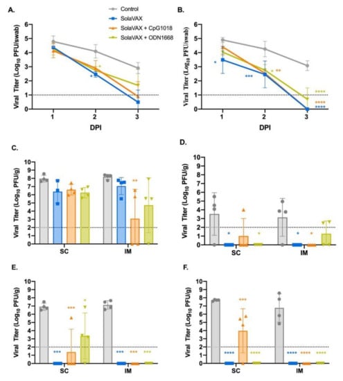 Viral loads from oropharyngeal swab and respiratory tract tissues after challenge with live virus. Oropharyngeal swabs were taken from all hamsters on 1, 2, and 3 days post infection (dpi). Viral titers of swabs collected from hamsters vaccinated via SC (A) and via IM (B) were determined by plaque assay. The presence of infectious virus was also determined in turbinates (C), trachea (D), right cranial lung lobe (E), and right caudal lung (F) of each hamster three days after live virus challenge. Data points represent group mean +/− SD. SC, subcutaneous vaccination. IM, intramuscular vaccination. Asterisks above bars indicate statistically significant difference in viral titers between Control and vaccine group (**** p < 0.0001, *** p < 0.001, ** p < 0.01, * p < 0.05). Limit of detection denoted as horizontal dotted line.