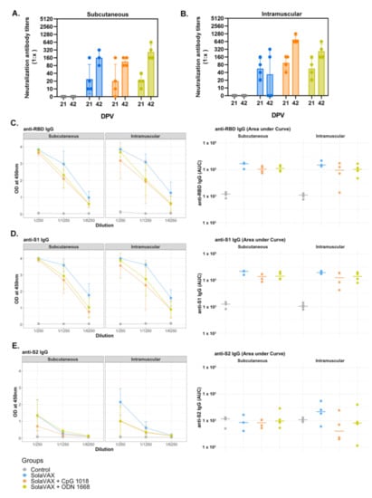 The detection of neutralizing antibodies in hamsters by PRNT90 after vaccination (A,B), and serum reactivity to spike protein’s RBD, S1 and S2 region (C–E). A plaque reduction neutralization test with a cutoff of 90% was used to determine neutralizing antibody production after 21and 42 days post vaccination (DPV) for both SC (A) and IM (B) routes of vaccine administration. The prime vaccination was given at 0 DPV and a booster vaccination given at 21 DPV. Data points represent group mean +/− SD. Results of ELISAs measuring serum reactivity to RBD (C) and S1 (D) and S2 (E) protein. Graphs on the left panel shows optical density (OD) at 450 nm (y-axis) vs. serum dilutions (x-axis). Values represent mean +/− SD, n = 4. Right panel shows area under the curve (AUC) calculated for each dilution for individual hamsters.