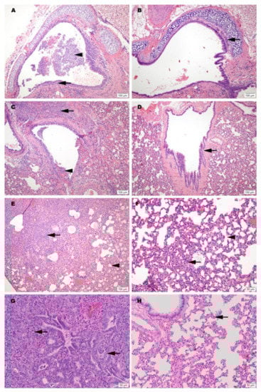 Representative histology of differences between unimmunized SARS-CoV-2 infected controls (A,C,E,G) and infected hamsters vaccinated with SolaVAX prepared SARS-CoV-2 virus and CpG 1018 adjuvant (B,D,F,H). Images A-F are taken at 3 dpi and images G-H are taken at 7 dpi. (A) Trachea with dense submucosal lymphocytic and neutrophilic inflammation infiltrating mucosal epithelium (arrow) and accumulation of neutrophils within the tracheal lumen (arrowhead). (B) Trachea with mild submucosal lymphocytic inflammation. (C) Large bronchus with dense lymphocytic and suppurative inflammation in the interstitium (arrow) and accumulation of neutrophils in the lumen with loss of mucocal epithelium (arrowhead). (D) Large bronchus minimally affected by inflammation (arrow). (E) Effacement of lung alveolar tissue by consolidating interstitial pneumonia (arrow) and overall decrease in alveolar air space (arrowhead). (F) Interstitial pneumonia increasing alveolar wall thickness (arrowhead) without compromising alveolar air space (arrowhead). (G) Lymphocytic interstitial pneumonia surrounds dense pneumocyte epithelial regeneration (arrows) at day 7 of infection. (H) Minimal evidence of interstitial pneumonia (arrow) and an absence of epithelial regeneration.