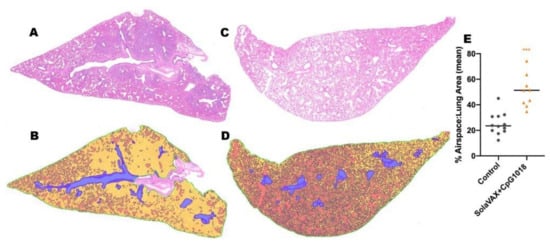 Histological evidence of protection was also present in a second group of challenged hamsters vaccinated IM with CpG. This group was held for a total of 7 dpi before necropsy. Results from this group showed reduced levels of alveolar damage, including minimal presence of interstitial pneumonia and an absence of epithelial pneumocyte regeneration (Figure 4). Absence of these pathological changes preserved air passage integrity, with increased airspace per lobe in CpG (IM) hamsters compared to unvaccinated controls (Figure 5). The distinction in outcomes was even more apparent at 7 dpi than what was observed at 3 dpi in the vaccinated group. These differences were present despite the fact that no live virus was observed in tissue samples taken from this test group.