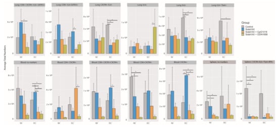 Statistically significant flow cytometry populations within intramuscular and subcutaneously vaccinated groups. The bar plots show the statistically significant populations identified through cyto-feature engineering for each organ. The x-axis shows the eight groups studied. The average total numbers of cells for each group were calculated and shown. The population names listed at the top of each small plot indicates the flow cytometry markers that are positive in the population. Note that these populations are negative for all of the other markers in the panel. * p < 0.05.