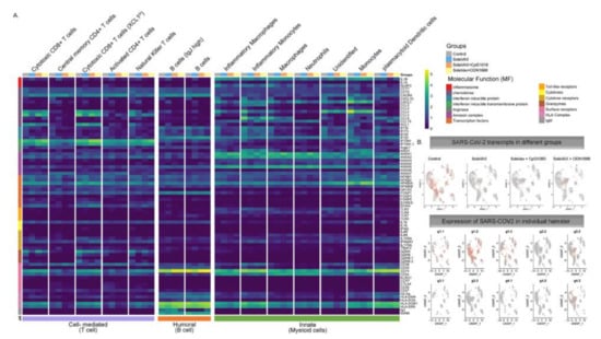 Average log fold change gene expression analysis. (A) Average log fold change gene expression comparing pooled gene expression between Control, SvX, CpG, and ODN for different molecular functions across different cell types. Column annotation bar at the top represents different groups, column annotation bar at the bottom represents major immune response type and row annotation bar on the left represent different molecular functions. Cell types are annotated above each cluster in the heatmap. (B) Expression of SARS-CoV-2 transcripts in different groups when merged (top panel) and in each individual hamster (bottom panel).