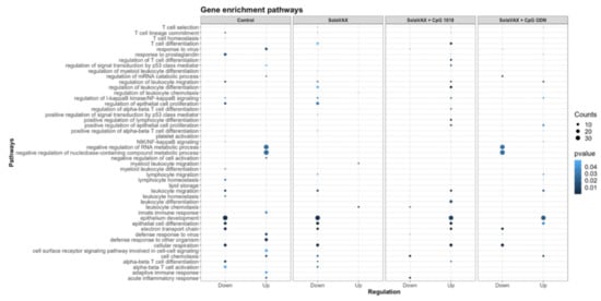 Enrichment p values for the selected Gene Ontology (GO) biological pathways of differentially expressed genes between Control and SolaVAX vaccinated hamsters, with or without adjuvant. Circles represent normalized enrichment score (NES), size of the circle represents the number of genes involved in the pathway and the color represents the significance score. p < 0.05 was considered significant.