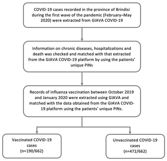 The overall vaccination status of COVID-19 patients was assessed using the Regional Immunization Database (GIAVA). GIAVA is a computerized vaccination registry containing information on the vaccination history of every Apulian inhabitant; it can also be used to generate an immunization schedule. For the 2019–2020 influenza season, the Apulian Government recommended vaccination with the inactivated tetravalent formulation for all inhabitants between the ages of 6 months and 64 years and for those between the ages of 65 and 74 years who were in good health; for inhabitants 65–74 years of age and suffering from chronic disease and in all inhabitants ≥75 years, the adjuvanted trivalent formulation was recommended [18]. Records of influenza vaccination between October 2019 and January 2020 were extracted and matched with the data obtained from the GIAVA COVID-19 platform using the patients’ unique PINs (Figure 1).