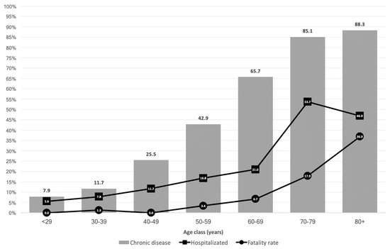 Proportion of patients per age class with at least one chronic disease, hospitalization rate for COVID-19, and fatality rate.