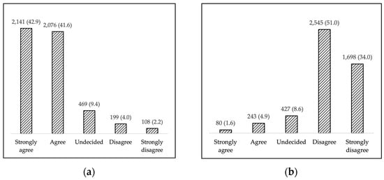 Overall, 84.5% (n = 4217) of the participants agreed with the Law n.119/2017 [], with strong agreement reported by 42.9% of them; 9.4% (n = 469) were undecided, while 6.1% (n = 307) disagreed—strongly in 2.2% (n = 108) of the cases (Figure 1a). When asked the same question after experiencing the COVID-19 pandemic, most of the parents/guardians disagreed (n = 2545, 51%) or strongly disagreed (n = 1698, 34%) (Figure 1b).