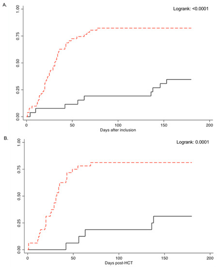 - Yong, M.K.; Ananda-Rajah, M.; Cameron, P.U.; Morrissey, C.O.; Spencer, A.; Ritchie, D.; Cheng, A.C.; Lewin, S.R.; Slavin, M. Cytomegalovirus Reactivation Is Associated with Increased Risk of Late-Onset Invasive Fungal Disease after Allogeneic Hematopoietic Stem Cell Transplantation: A Multicenter Study in the Current Era of Viral Load Monitoring. Biol. Blood Marrow Transplant. 2017, 23, 1961–1967. [Google Scholar] [CrossRef]