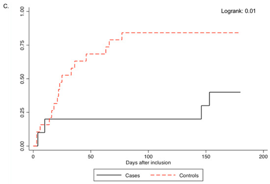 Seventy-eight patients were included (26 cases and 52 controls), with cases adequately matched to controls (Table 1). Patients were followed for a mean of 163.1 days (range 8, 180), corresponding to 163.1 (range 41, 180) and 163.2 (range 8, 180) days for cases and controls, respectively (p-value: 0.99). The proportions of patients who had developed csCMV infection before inclusion were similar in both groups (p-value: 1.00).