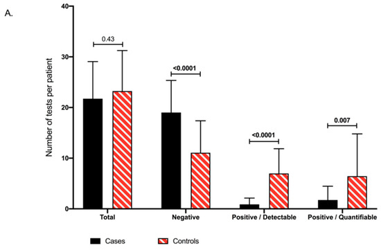 Overall, 1773 CMVqPCR tests were performed, 565 (mean: 22/patient; range 6, 37) for cases and 1208 (mean: 23/patient; range 3, 42) for controls (p-value: 0.43; Figure 2A). A significantly higher number of negative tests was observed in cases (19.0, range: 6, 34) as compared to controls (11.1, range: 0, 25; p-value < 0.0001; Figure 2A,B). Similarly, a significantly lower number of positive/detectable (≥LOD: 56 IU/mL) CMVqPCR (0.9, range: 0, 4) and positive/quantifiable (≥LOQ: 137 IU/mL) CMVqPCR tests (1.8, range: 0, 9) were observed in cases compared to controls (7.0, range: 0, 19; p-value < 0.0001 and 6.4, range: 0, 18; p-value: 0.007, respectively; Figure 2A,B). Absolute values of all positive/quantifiable CMVqPCR tests were significantly lower in cases (1461 IU/mL, range: 139, 11,900) compared to controls (3727 IU/mL, range: 138, 132,000; p-value < 0.0001; Figure 2C).