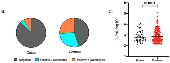 (A) Numbers of quantitative CMV PCR detection tests performed during the study period between cases and controls, presented as negative (<56 IU/mL), positive/detectable (56–136 IU/mL) and positive/quantifiable (>137 IU/mL). (B) Proportions of negative, positive/detectable and positive/quantifiable CMV PCR tests between cases and controls. (C) Absolute values of positive/quantifiable quantitative CMV PCR tests between cases and controls.