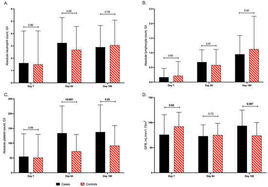 There were no differences in the mean values of neutrophil and lymphocyte counts between cases and controls at any of the predefined time-points (Figure 3A,B). In contrast, significantly higher mean platelet counts were observed by day 84 in cases (134 G/L) compared to controls (73 G/L; p-value < 0.001) and by day 180 post-inclusion in cases (138 G/L) compared to controls (92 G/L; p-value: 0.03; Figure 3C). When looking at subgroups, platelet counts were significantly increased in cases (132 G/L) compared to controls (79 G/L, p-value: 0.01) by day 84 in the D-R+ group (Figure S2A). Similarly, in the GvHD group, platelet counts were higher in cases compared to controls (181 G/L vs. 63 G/L, p-value < 0.001) by day 180 (Figure S2B). Although cases had worse renal function at baseline (GFR: 76 mL/min/1.73 m2) compared to controls (GFR: 92 mL/min/1.73 m2; p-value: 0.04), by the end of the study, GFR was significantly improved in cases (94 mL/min/1.73 m2) versus controls (74 mL/min/1.73 m2; p-value: 0.006; Figure 3D). There were no differences observed in liver function tests between cases and controls.