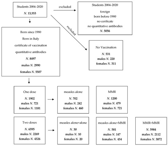 According to Italian law on safety and health at work [15], the students belonging to the degree courses of the Medical School of Padua University (medicine and surgery, dentistry, and healthcare professions) are submitted to health surveillance in the second (medicine and surgery until 2016 and dentistry) or the first (medicine and surgery since 2017 and healthcare professions) year of course. From 2004 until February 2020, 13,553 students had been screened measuring antibodies of transmissible, but preventable diseases. Enrollment criteria included (i) having been vaccinated against measles, (ii) having been born in Italy, and hence having likely the same vaccination schedules since 1980, as measles vaccination was implemented in Italy in 1979, (iii) availability of the certificate of vaccination released from the Public Health Office, and (iv) a quantitative measurement of antibodies against measles. According to these criteria (Figure 1), enrolled students were 8497 (62.7%) (2990 males and 5507 females, ratio males/females 0.54). Unvaccinated students (531, 5.9%) were excluded.