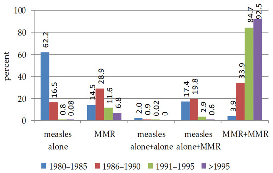 The vaccination schedule (Figure 2) is very different depending on the year of birth. One dose of vaccine was prevalently adopted before 1990, with a prevalence of measles alone before 1985. Children born after 1995 were covered by two doses of MMR vaccine.