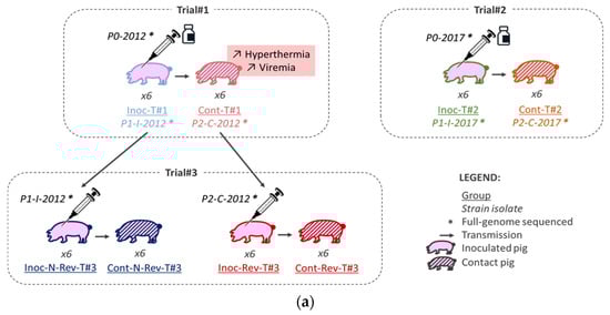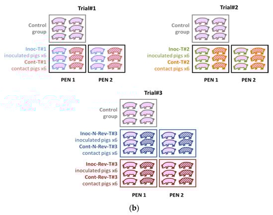 The trials were performed in 2012 (Trial#1) and in 2017 (Trial#2 and Trial#3) in our Biosafety level 3 (BSL-3) animal facilities in Anses, Ploufragan-Plouzané-Niort laboratory, following the same experimental conditions (Figure 1a).