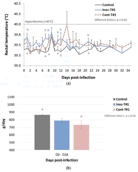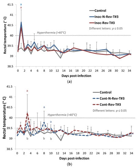 Evolution of the mean rectal temperatures (°C) in inoculated pigs (a) and contact pigs (b) after inoculation (day 0) during Trial#3. Different letters (“a” and “b”) indicate that the groups are significantly different from each other with p ≤ 0.05.