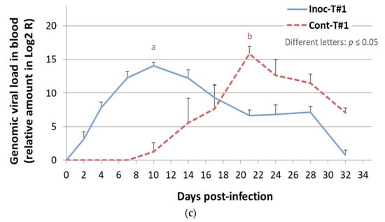 Results from Trial#1. Evolution of the mean rectal temperatures (°C) (a) and of the average daily weight gain (ADWG) (g/day) (b) in inoculated Trial#1 (Inoc-T#1) pigs and in contact Trial#1 (Cont-T#1) pigs after inoculation (day 0). Different letters (“a” and “b”) indicate that the groups are significantly different from each other with p ≤ 0.05. (c) Evolution of the mean genomic viral loads in blood (relative amount expressed in Log2 R) in Inoc-T#1 inoculated pigs and in Cont-T#1 contact pigs after inoculation (day 0). Different letters (“a” and “b”) indicate that the groups are significantly different at peak values from each other with p ≤ 0.05.