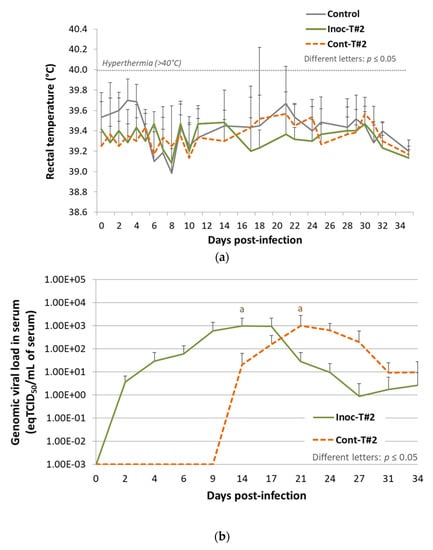 Results from Trial#2. (a) Evolution of the mean rectal temperatures (°C) in Inoc-T#2 inoculated pigs and in Cont-T#2 contact pigs after inoculation (day 0). Different letters indicate that the groups are significantly different from each other with p ≤ 0.05. (b) Evolution of the mean genomic viral loads in serum (eqTCID50/mL of serum) in Inoc-T#2 inoculated pigs and in Cont-T#2 contact pigs after inoculation (day 0). Different letters indicate that the groups are significantly different at peak values from each other with p ≤ 0.05.