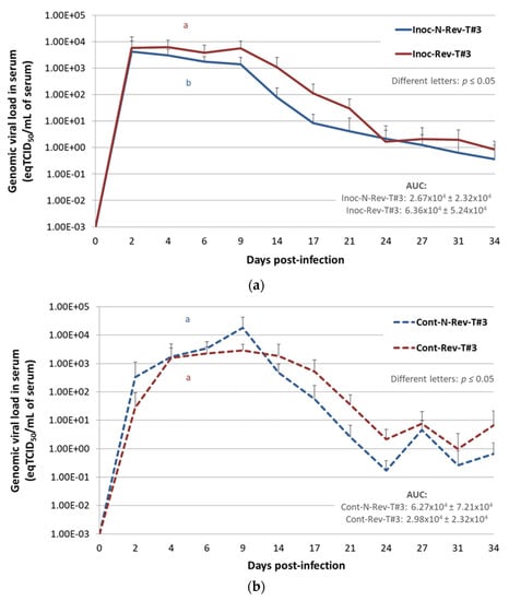 For Inoc-Rev-T#3 pigs a viremia plateau was early reached between 2 and 9 dpi with a maximal mean viremia at 4 dpi showing 103.80 ± 103.73 eqTCID50/mL of serum, then the genomic viral load started to decrease from 9 to 34 dpi (Figure 5a). Inoc-N-Rev-T#3 animals reached a slightly lower mean viremia peak with 103.63 ± 103.81 eqTCID50/mL of serum at 2 dpi and the genomic PRRSV load decreased then gradually from 2 to 34 dpi. However, at the end of the study at 34 dpi, PRRSV genome was still detected in inoculated animals for both groups. Throughout the study, from 2 to 34 dpi, genomic viral loads in serum from Inoc-Rev-T#3 pigs were always higher than viremia of Inoc-N-Rev-T#3 pigs, with a significantly higher average viremia AUC for Inoc-Rev-T#3 pigs (p = 0.013).