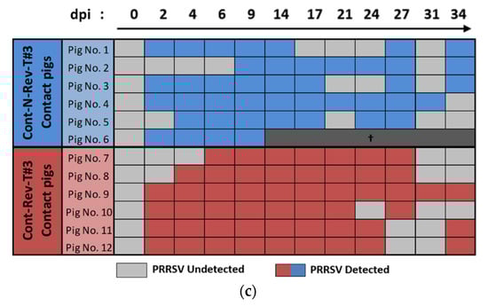 Excluding the Cont-N-Rev-T#3 pig euthanized at 10 dpi (pig No. 6), comparison of the average viremia AUC for Cont-N-Rev-T#3 and Cont-Rev-T#3 pigs did not reveal significant differences (p = 0.065) (Figure 5b). Regarding individual PRRSV genomic detections in serum, contact pigs started to become viremic from 2 dpi (1 day after contact with inoculated pigs) and all of them (6/6 per group) were PRRSV infected at 6 (5 days of contact) and 9 (8 days of contact) dpi in Cont-Rev-T#3 and Cont-N-Rev-T#3 groups, respectively (Figure 5c).