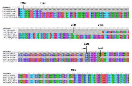 Alignment of the four PRRSV forms (three deletion variants and one full-length sequence) found in both Porcilis® PRRS batch No. A142DB01 (Trial#1) and batch No. A207CB01 (Trial#2) with the KF991509.2 full-genome sequence of Porcilis® PRRS DV strain as reference. Alignment targeted nucleotide positions from 2213 to 2545, including the deleted region (position No. starting from the first nt of 5′ nontranslated region (5′NTR)).