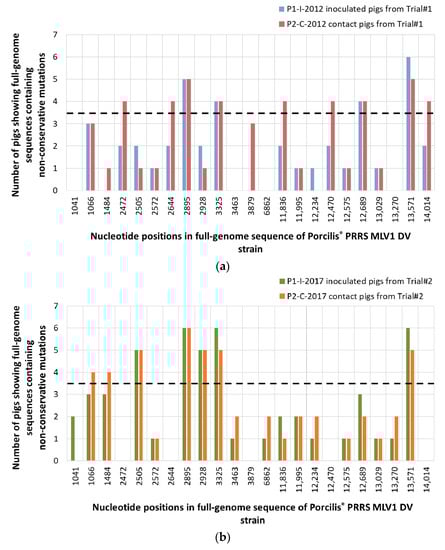 Distribution of the non-conservative mutations among inoculated and contact pigs from Trial#1 (a) and from Trial#2 (b), using the P0-2012 or the P0-2017 sequences as references, respectively. Mutation locations were indicated in the nucleotide sequence starting from the first nt of the 5′ nontranslated region (5′NTR) on the KF991509.2 full-length sequence. Mutations were considered as significant when occurred in at least 4/6 pigs (dotted line).