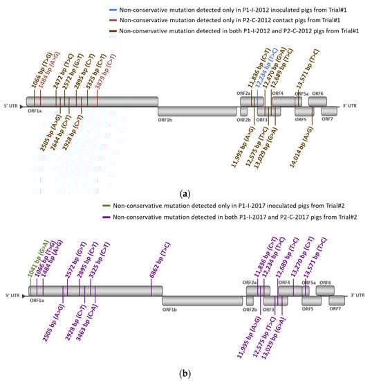 Localization in the PRRSV-1 genome of the identified non-conservative mutations occurred in P1-I-2012 and P2-C-2012 pigs during Trial#1 (a) or in P1-C-2017 and P2-C-2017 pigs during Trial#2 (b), using, respectively, the P0-2012 or the P0-2017 sequences as references. Mutation locations were indicated in the nucleotide sequence starting from the first nt of the 5′ nontranslated region (5′NTR) on the KF991509.2 full-length sequence and the start codon of each open reading frame (ORF), respectively.