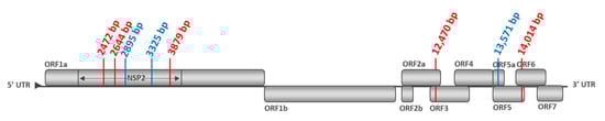 For Trial#2, comparison between P0-2017 sequence (from the vaccine batch No. A207CB01) and P1-I-2017 sequences from vaccinated pigs showed 11 non-conservative mutations detected in at least two pigs, including five mutations present in at least 4/6 pigs (Figure 7b, Figure 8b and Figure S4). Among the mutations found in the vaccinated pigs in both trials, three of them were present in almost all pigs: in nt position 2895 bp and 3325 bp in ORF1a and 13,571 bp in ORF5a. These mutations shared between both experiments could be potentially linked to the re-adaptation of the vaccine strain to the pig host following vaccination (Figure 9).