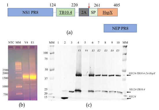 The structure and stability of the chimeric NS gene segment and proteins encoded. (a) The structure of NS gene OFRs of the Flu/THSP recombinant virus. The chimeric NS1 protein is synthesized from unspliced mRNA. TB10.4 antigen is directly linked to 124 amino acids of NS1; the HspX antigen is separated by the 2A “autoproteolysis” site and supplied with secretion signal peptide. NEP protein is synthesized from the spliced mRNA; (b) Full-length RT-PCR amplicons of the NS gene segment of the Flu/THSP virus passage variants V4 and E1. MM—marker in kb pairs; (c) Western blot detection of chimeric NS1 protein in cells infected by the Flu/THSP virus passage variants (lanes 4–10). MM—marker in kDa, lane 1—uninfected cells, lane 2—cells infected with empty virus vector A/PR8/NS124, lane 3—cells, infected with the A/PR8/NS124-TB10.4 recombinant virus carrying only TB10.4 antigen.
