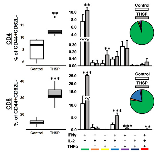 Immune response in mice after intranasal immunization with Flu/THSP recombinant virus. Antigen-specific effector memory T-cellular immune response in the spleen was assessed eight days after immunization by estimating the number of CD4/8+ CD44+CD62L- effector memory (EM) T-cells expressing IFNγ, IL-2, and TNFα after 24 h stimulation with BCG. Box plots represent the total amount of cytokine-producing EM T-cells. Bar-plots represent the average percentage of each cytokine-producing population within the total EM T-cells subset ± SD. Pie charts show the average percent of each cytokine-producing population within a total subset of cytokine-producing cells. The differences between groups were analyzed using the Student’s t-test (** p < 0.01, and *** p < 0.001, n = 5).