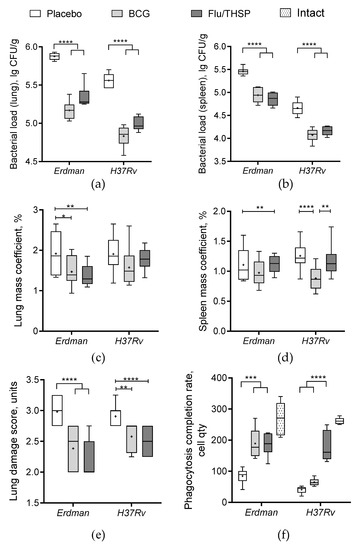 Protective efficacy of Flu/THSP in a mouse model of TB infection. Protective efficacy of Flu/THSP vaccinated mice six weeks post TB infection. Mice were immunized with Flu/THSP or BCG or placebo (indicators are shown on top), challenged with virulent M. tb Erdman or H37Rv strain as indicated, and analyzed six weeks post-infection. (a,b) Bacterial load in lungs and spleen was measured by titration of tissue homogenates; (c,d) Lungs and spleen mass coefficients were estimated as the percentage of organ weight relative to body weight; (e) The lung damage score was quantified in conventional units as described in Section 2.6; (f) Phagocytosis completion rate of model yeast cells was measured. Statistical analyses were performed by two-way ANOVA, and the results of the Bonferroni post-hoc-test for a pairwise comparison are presented by asterisks (* p < 0.05, ** p < 0.01, *** p < 0.001, and **** p < 0.0001).