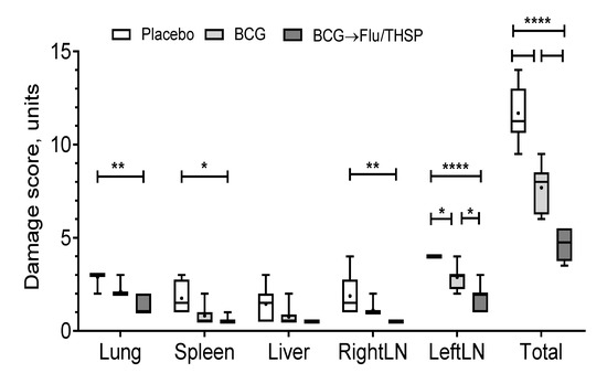 Protective efficacy of BCG-prime → Flu/THSP boosts immunization against tuberculosis damage in a guinea pig model. Damage score of tuberculosis-specific inflammation in vaccinated and control guinea pigs 8.5 weeks post-challenge with the Mtb H37Rv strain. The score of specified organ damage was estimated visually as described in Materials and Methods. Statistical significance was measured by two-way ANOVA (familywise p < 0.0001) with the Bonferroni post-hoc-test for pairwise comparison (* p < 0.05, ** p < 0.01, **** p < 0.0001).