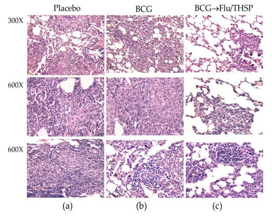 Protective efficacy of BCG-prime → Flu/THSP boosts immunization against lung pathology in a guinea pig model of TB infection. Representative H&E stained lung histological sections of vaccinated and control guinea pigs (indicated above) after infection with M.tb H37Rv strain, magnification is indicated at the left. (a)—intensive inflammation foci with a large number of degrading neutrophils and nuclear debris are demonstrated; merging granulomas are characterized by large areas of caseous necrosis; (b)—the particular focus of specific infiltration can be found; (c)—the small peribronchiolar focus of specific infiltration can be found.