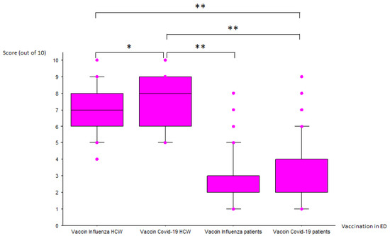 Ghazali, D.A.; Choquet, C.; Bouzid, D.; Colosi, L.; Ben Hammouda, A.; Wargon, M.; Gay, M.; Vaittinada Ayar, P.; Douay, B.; Revue, E.; et al. Analysis of the Feasibility of a Vaccination Campaign against Influenza Epidemic and COVID-19 Pandemic in French Emergency Departments: A National Survey. Vaccines 2021, 9, 400. https://doi.org/10.3390/vaccines9040400