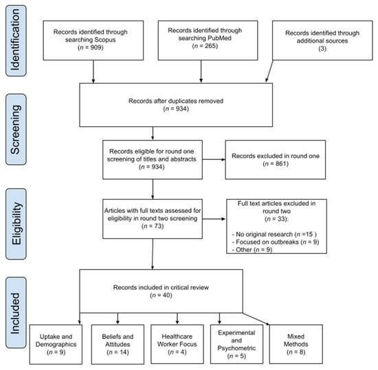 After conducting our review (Figure 1), we identified five themes that are divided by the methodology and focus of the studies as follows: (1) Uptake and Demographics; (2) Beliefs and Attitudes; (3) Healthcare Worker Focus; (4) Experimental and Psychometric Intervention; and (5) Mixed Methods.