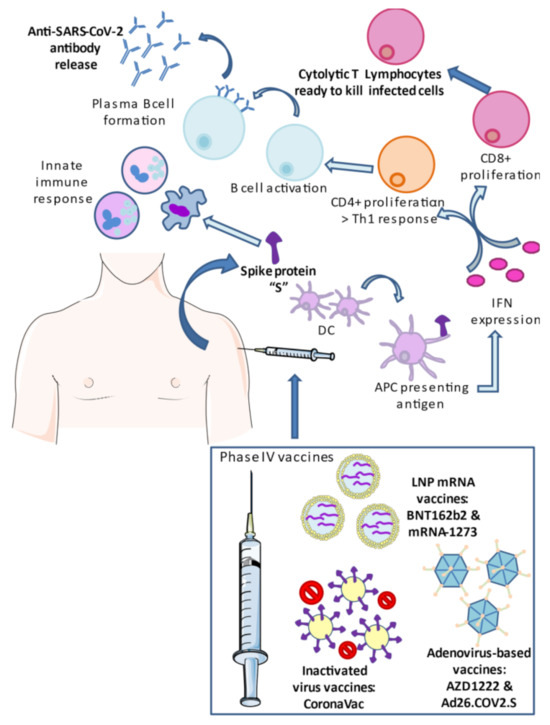 Every person is susceptible to SARS-CoV-2 infection, but certain groups are more likely to suffer from severe presentations of the disease. These groups include older people [22], patients with comorbidities and non-communicable diseases [23,24], and also pregnant women [25,26]. They all share an altered immune status, which is key to fully understanding SARS-CoV-2’s pathogenesis. It is important to characterize the innate immune response, the first line of defense provided by macrophages and granulocytes, which acts in coordination with adaptive immune cells T and B lymphocytes and concludes with the production of antibodies or immunoglobulins (Ig) that are specific against SARS-CoV-2 [27]. Previous studies have observed that IgM and IgG appeared 15 days after infection, with detectable seroconversion 3–4 weeks after symptom onset [28]. Importantly, IgA appears earlier and is more prolonged than IgG in its persistence [29]. Importantly, the Ig levels in some mild cases can be low or undetectable, which leaves the potential for re-infections [30]. The S protein is the major target of human Ig, hence inducing SARS-CoV-2 neutralization [31], whereas Igs against the N protein may also be produced, although without neutralization [32]. However, if the immune response fails, SARS-CoV-2 may be able to disseminate throughout the organism, promoting an aberrant immune response with uncontrolled cytokine production (a so-called “cytokine storm”), acute respiratory-distress syndrome (ARDS), and multiorgan failure [33]. In fact, immune cells, as well as inflammatory components, have been proven to be valuable markers for predicting COVID-19 fatality [34]. Therefore, it is crucial to ensure an adequate immune response to prevent or mitigate SARS-CoV-2 infection. During the last year, different therapeutic approaches to limiting the severe damage caused by COVID-19 have been studied. For instance, protease inhibitors to block SARS-CoV-2 entry, polyprotein maturation, or viral assembly; nucleoside analogues (e.g., remdesivir and ribavirin) to limit viral replication; chloroquine/hydroxychloroquine; or specific compounds targeting the immune system, such as interleukin-6 (IL-6) inhibitors and corticosteroids, are some examples of proposed therapies for combating SARS-CoV-2 infection [35,36]. Notwithstanding the efforts made in finding an effective treatment, there are still no approved therapies for COVID-19 and, although much attention was initially given to finding a potential cure, the lack of scientific evidence supporting the use of proposed treatments has shifted the focus to alternatives. In this context, vaccination could play a central role in this pandemic, limiting SARS-CoV-2 transmission, and COVID-19 cases. Furthermore, vaccination may provide countless benefits for the global situation on multiple levels, as discussed below.