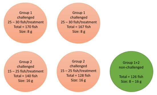 The week before the challenge, all fish in Experiment 2 were moved to the infection unit at DTU and kept in 180 L tanks with artificial saltwater (12‰) at 19 °C while gradually increasing the temperature to 26 °C up to the day of challenge (setup explained in Figure 1). As a result of the different rearing conditions, the previous 10 months, the mean weight of Group 1 and 2 at this time was approximately 8 and 16 g, respectively.