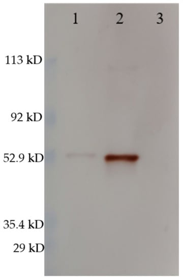 Western blot stained with rabbit-anti-nodavirus. (1) RGNNV (strain 283.2009), (2) RGNNV VLP, (3) MilliQ H2O. The RGNNV sample was concentrated virus obtained by ultracentrifugation of cell culture supernatant and was not quantified since impurities from the cell culture medium would contribute to total protein. The molecular weight indicated by the marker must be interpreted with caution since the marker was pre-stained (as described in Section 2.3). Uncropped photos are shown in the supplementary material (Figure S2).