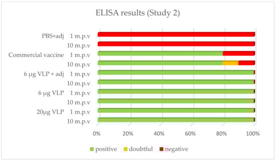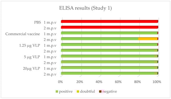 After vaccination, 100% of the sea bass immunized with the VLP formulations tested positive by ELISA whatever the time of sampling (1, 2 or 10 month p.v.). With the commercial vaccine, 100% of fish tested positive after 1 month in Study 1, while this proportion was 80% in Study 2. In both studies, 80% was positive in the latter sampling 2 or 10 months p.v., respectively. The positive, doubtful or negative detection (based on criteria set up in the methods) of specific antibodies against RGNNV in ELISA is presented in Figure 4 and Figure 5.